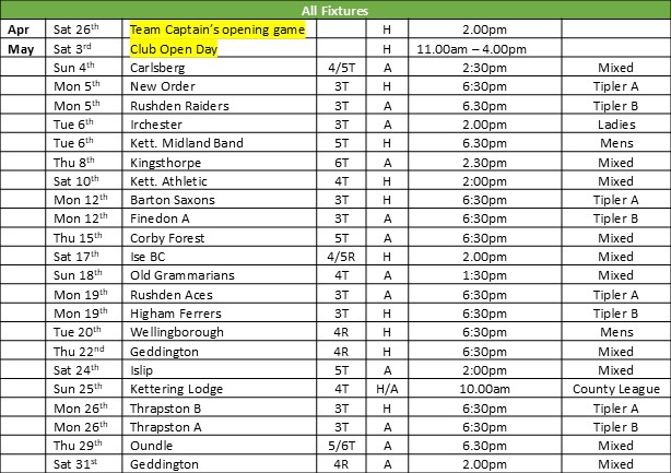 If a separate fixture type is required, Ladies, Men's, Mixed, County League or Ernest Tipler League can be found by clicking on the green links on this page or by selecting the 'drop down' on the Club Fixtures 2025 menu.
